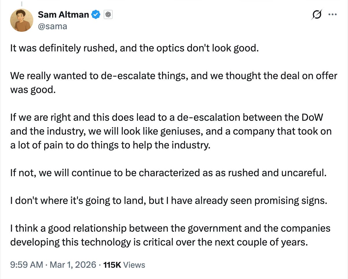 Sam Altman은 계약 후 공개 성명을 냈다. “우리도 자율 살상 무기와 대규모 감시는 금지한다.” 그리고 Anthropic의 블랙리스트 지정을 “매우 나쁜 결정”, “극도로 무서운 선례”라고 공개 비판했다. 경쟁사를 편든 것이다.