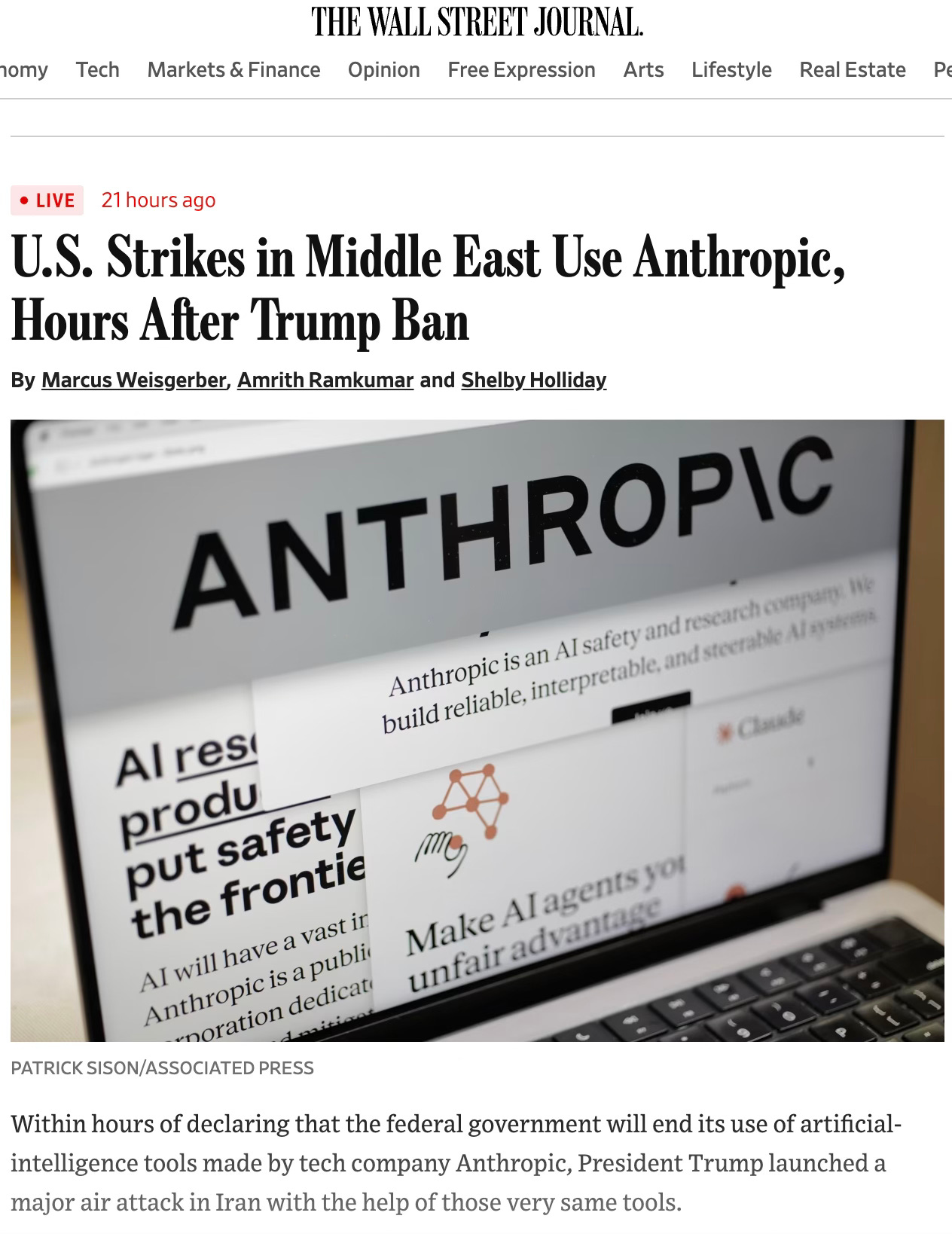 정리하면 이렇다. 1) Anthropic이 자율 살상 무기와 대규모 감시 사용을 거부했다. 2) 펜타곤은 계약을 파기했다. 3) OpenAI를 대안으로 서명했다. 4) 그리고 실전에서는 쫓아낸 Claude를 썼다.