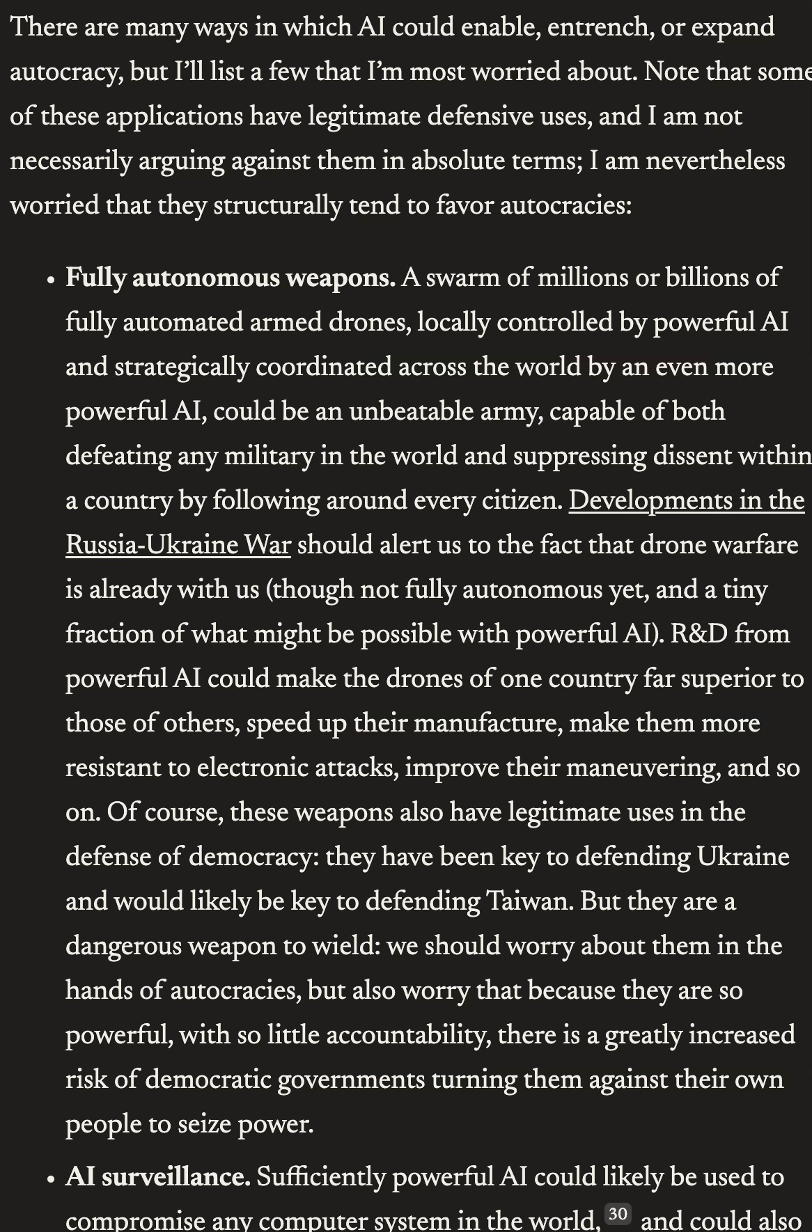 Amodei가 1월에 쓴 문장이 있다. “한 명 혹은 소수의 사람이 드론 군대를 다른 인간의 협조 없이 작동시킬 수 있는 구조를 가장 두려워한다.”